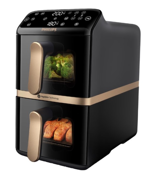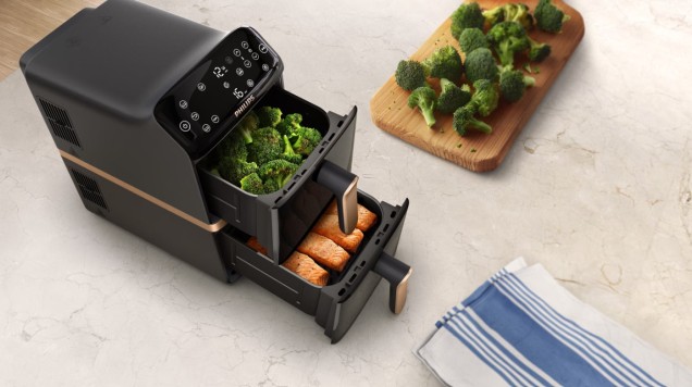 Nasz pionowy Philips Ovi z dwoma koszami pozwala przygotować dwa pełne posiłki jednocześnie, oszczędzając aż 45% miejsca na blacie. Co więcej, dzięki technologii Vertical RapidAir smak posiłków jest zawsze niezwykle wyraźny i delikatny.
